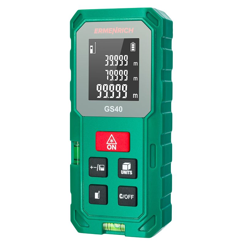 Ermenrich Reel PLUS GS40 оснащена функциями вычисления площади и объема, что особенно удобно при планировании ремонта, закупке материалов или проектировании. Пользователь может выбирать единицы измерения — метры, футы или дюймы для длины, а также соответствующие квадратные и кубические единицы для площади и объема. Встроенный функционал «Пифагор» позволяет рассчитывать недоступные расстояния с помощью косвенных измерений, что особенно полезно в условиях ограниченного пространства или сложной геометрии объекта.