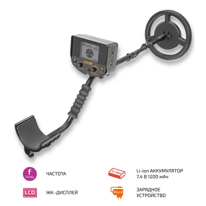 Металлоискатель работает на частоте 7,2 кГц, что обеспечивает высокую чувствительность и точность обнаружения. Катушка размером 30 см обеспечивает надежную работу устройства в различных условиях, включая высокую влажность грунта.