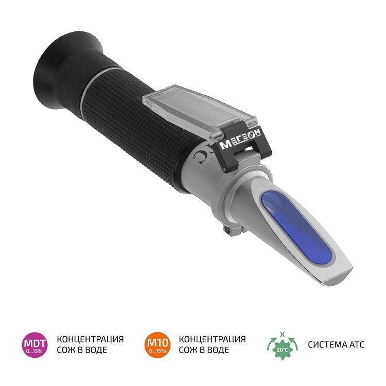МЕГЕОН 72024 - это рефрактометр, предназначенный для измерения концентрации смазочно- охлаждающих жидкостей. Имеет две шкалы: М-10 позволяет контролировать большинство видов СОЖ, представленных на рынке, к которым относятся минеральные, полусинтетические и синтетические, а MDT - подобные растворы, но только с содержанием силиконовых присадок. Принцип действия прибора заключается в проекции отраженного света на экран с градуировкой, пройдя перед этим через проверяемое вещество. Для проверки необходимо нанести две- три капли на плоскость призмы и придавить прижимным стеклом. Далее настроить фокусировку и считать показания. Измеритель не требует источников питания, специальных знаний и навыков. Прост в обращении, а благодаря наличию автоматической температурной коррекции достигается максимальное удобство при эксплуатации.