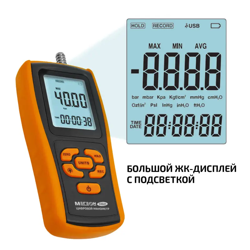 МЕГЕОН 51021 предлагает множество единиц измерения, включая бар, мбар, кПа, кгс/см², мм рт. ст. и другие. Это делает его универсальным инструментом, подходящим для различных задач и отраслей. Большой ЖК-дисплей с подсветкой обеспечивает удобство считывания данных даже в условиях недостаточной освещенности, а функция удержания данных и возможность записи результатов делают манометр еще более практичным для длительной работы.