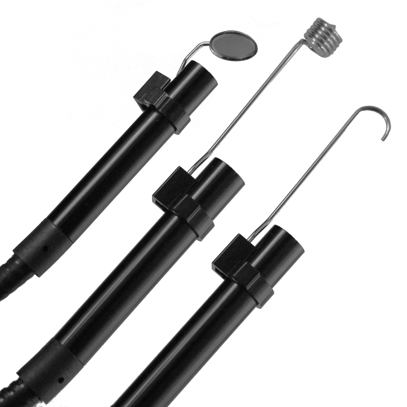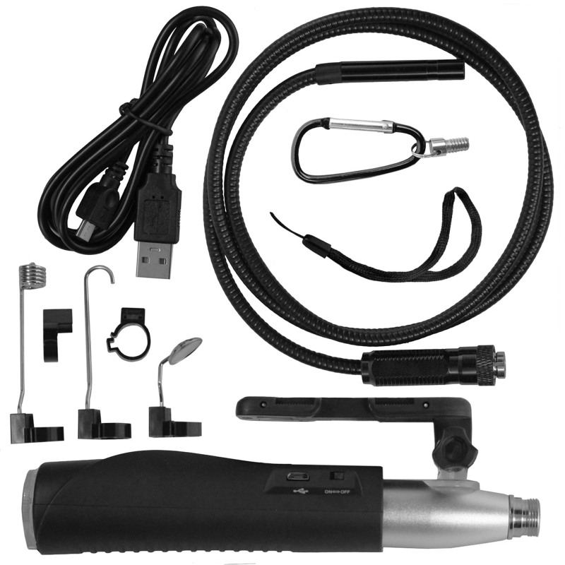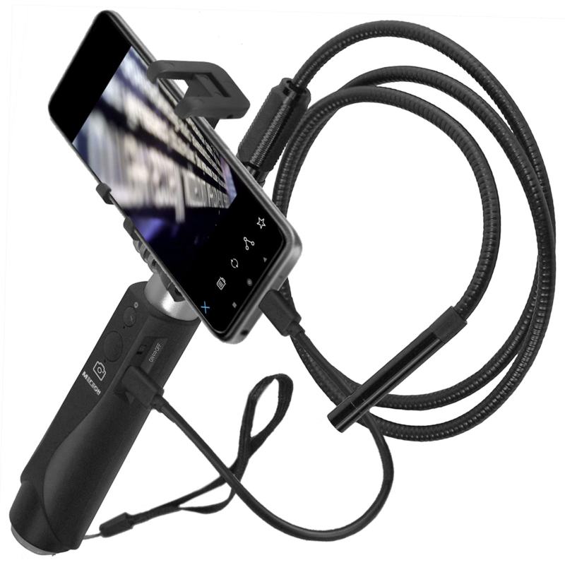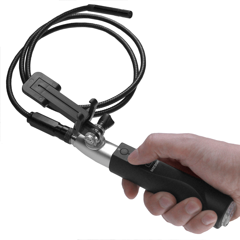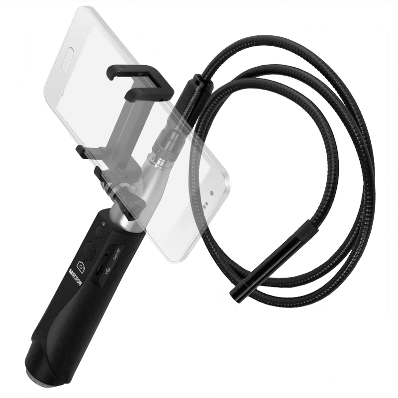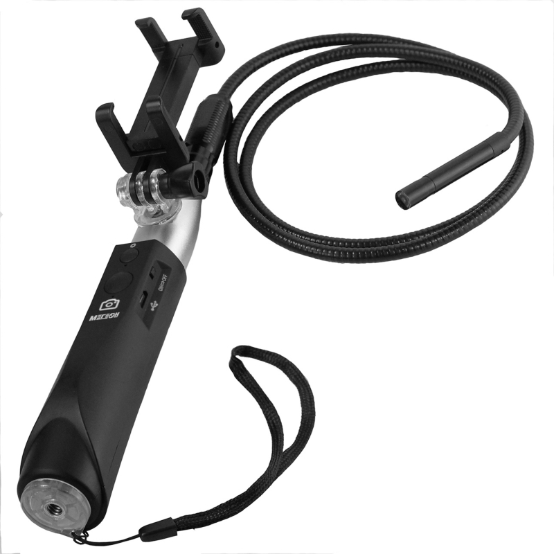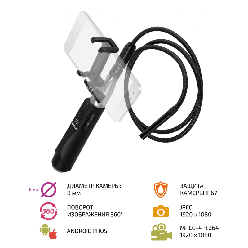Полноценный видеоскоп для подключения к мобильному устройству на платформе Android и IOS посредством Wi-Fi соединения. Снабжён удобной рукояткой с держателем смартфона и полужёстким зондом с пыле-влагозащищённой камерой диаметром 8 мм. Модель сочетает в себе: эргономичную форму, небольшие размеры, вес и высокие эксплуатационные характеристики. Видимость пространства перед камерой обеспечивается яркой светодиодной подсветкой. Для выполнения специфических задач в комплекте к изделию имеются дополнительные насадки: крючок, магнит и зеркало. Транспортировка и хранение выполняется в удобном футляре, в котором хранится прибор и аксессуары к нему. Прибор станет незаменимым помощником как в быту, так и на производстве. Его функционал по достоинству оценят как любители, так и профессионалы.
